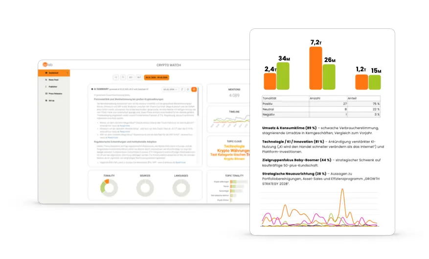 Dank KI-gestützter Analysefunktionen erhalten Sie präzise Reports – von kompakten Executive Summaries bis hin zu detaillierten Medienresonanzanalysen mit belastbaren Kennzahlen für PR, Kommunikation und Management.m