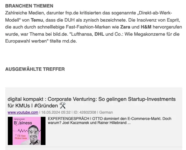 Mit Hilfe des umfangreichen täglichen Morning Briefings können auf effektive Weise Meinungen, Trends und Krisen deutlich schneller erkannt werden. Darüber hinaus hilft die tägliche Übersicht der Konzernleitung bei der schnellen Lageeinschätzung der dezentral gesteuerten Kommunikationsaktivitäten aller Konzernmarken.